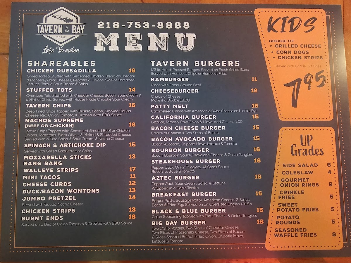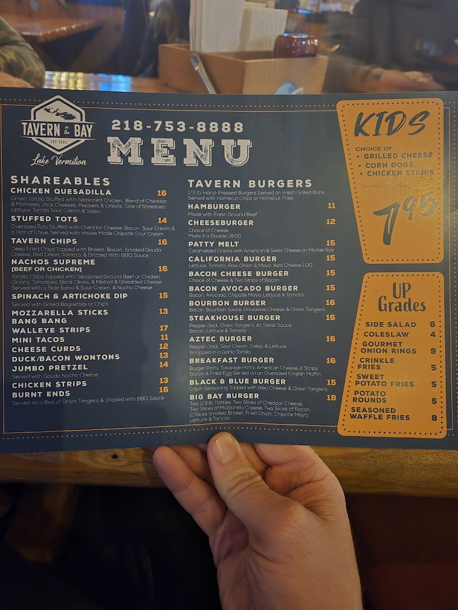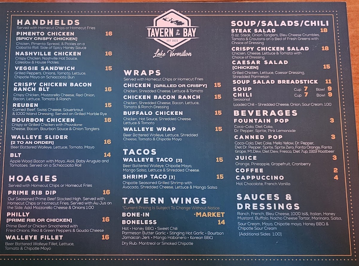 The Tavern In The Bay Menu offers a delicious mix of flavors, perfect for anyone looking for a cozy, lakeside meal in Tower, MN. Located at 2007 Co Rd 77, this spot is known for its welcoming atmosphere and hearty meals that hit the spot whether you're here for a casual bite or a more relaxed dinner out. With a variety of options, from fresh seafood to tender steaks, there's something for everyone on the menu. Each dish is made with care, using fresh ingredients that showcase the local flavors. Whether you're in the mood for a juicy burger, a crispy fish fry, or a flavorful salad, you'll find it here. Pair your meal with one of their specialty drinks or a refreshing local brew for the full experience. You’ll want to return again and again to discover more of what’s on offer at this inviting restaurant by the bay.
