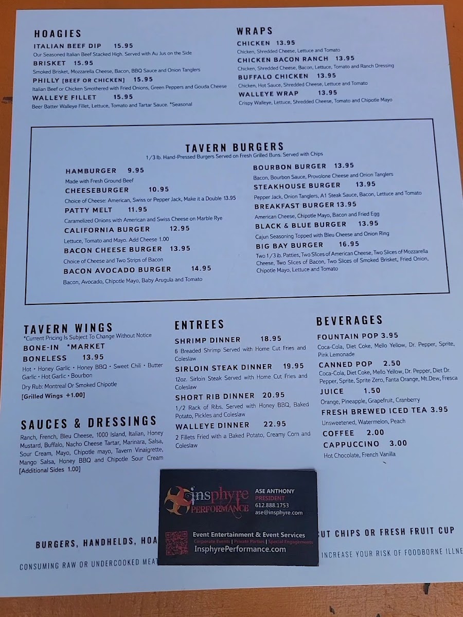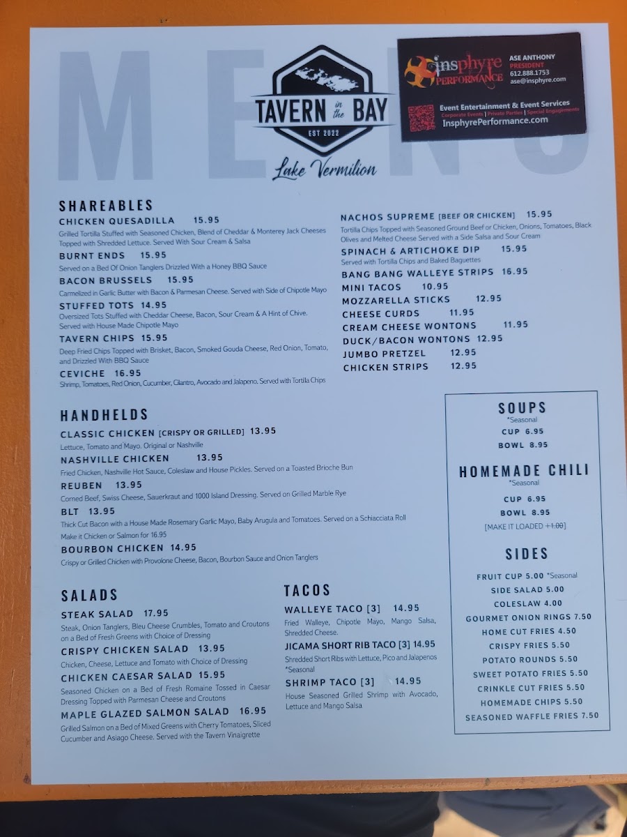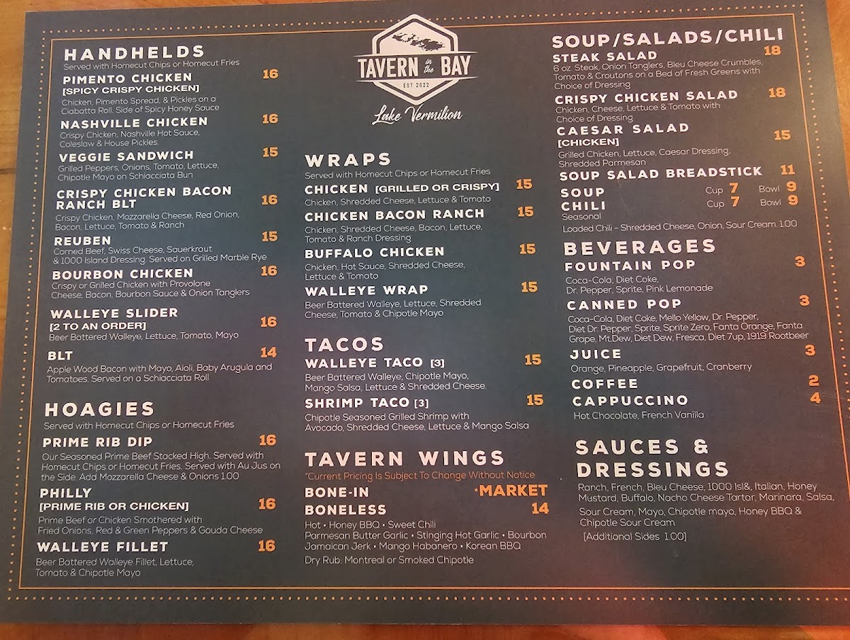 The Tavern In The Bay Menu offers a delicious mix of flavors, perfect for anyone looking for a cozy, lakeside meal in Tower, MN. Located at 2007 Co Rd 77, this spot is known for its welcoming atmosphere and hearty meals that hit the spot whether you're here for a casual bite or a more relaxed dinner out. With a variety of options, from fresh seafood to tender steaks, there's something for everyone on the menu. Each dish is made with care, using fresh ingredients that showcase the local flavors. Whether you're in the mood for a juicy burger, a crispy fish fry, or a flavorful salad, you'll find it here. Pair your meal with one of their specialty drinks or a refreshing local brew for the full experience. You’ll want to return again and again to discover more of what’s on offer at this inviting restaurant by the bay.